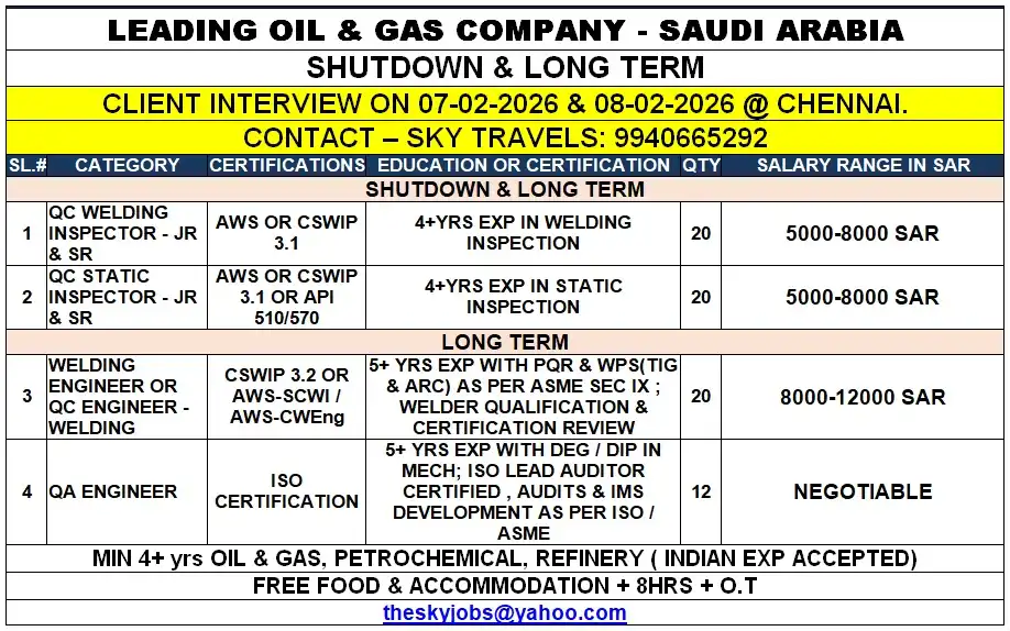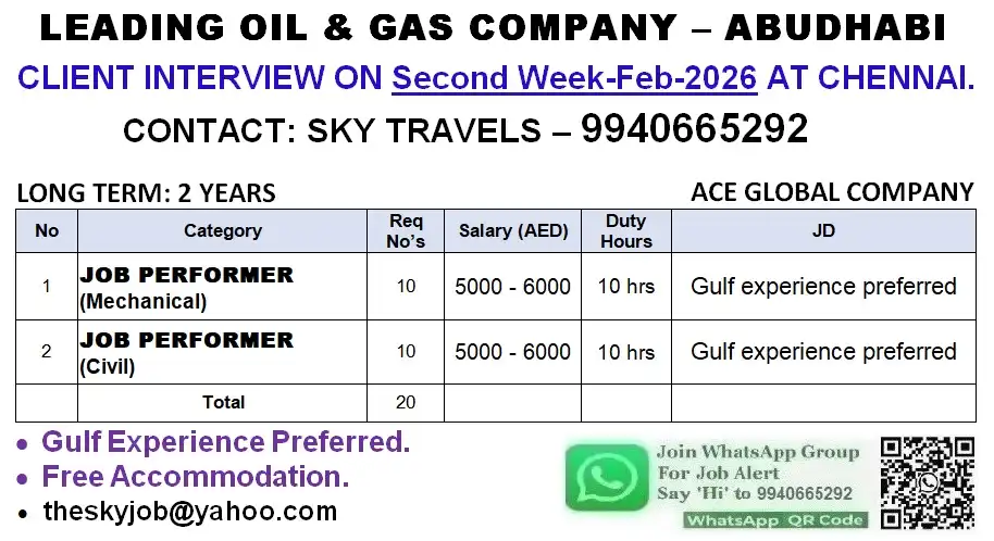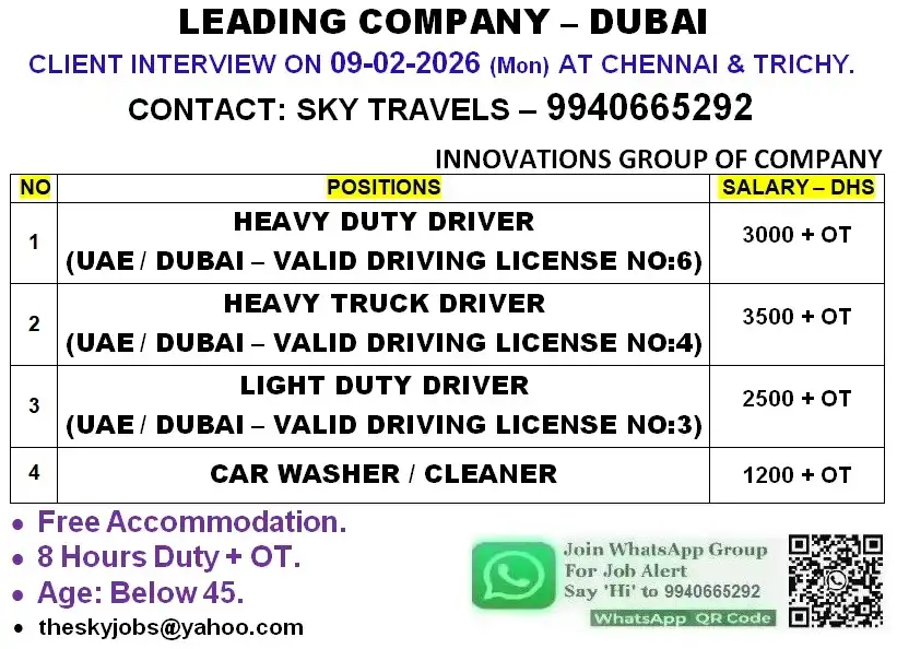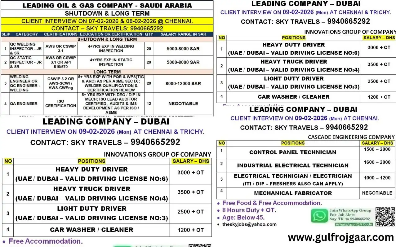 Multiple urgent job openings are available for Saudi Arabia (Oil & Gas sector) and Dubai (Driving, Electrical, Mechanical & Technician roles) with direct client interviews in Chennai and Trichy. Candidates must have relevant experience, valid documents, and for driver roles a valid UAE driving license as per category. Attractive salaries, overtime, free accommodation, and long-term opportunities are offered by reputed companies.