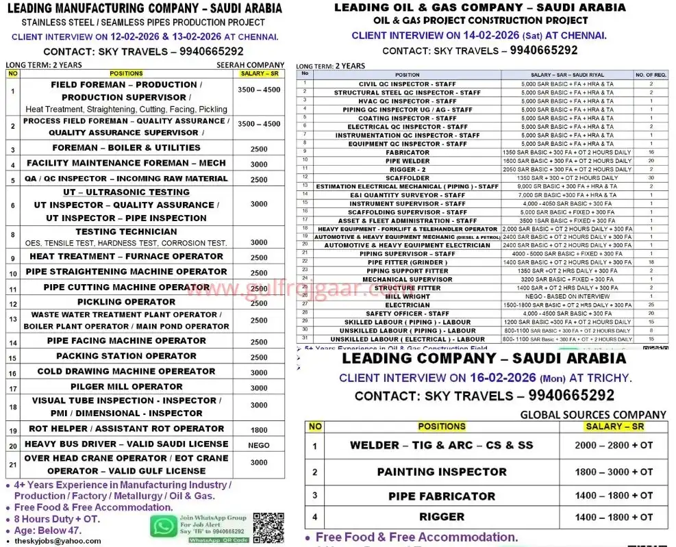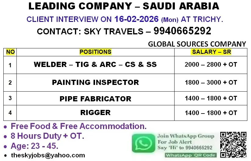 Hiring for Saudi Arabia | Sky Travels is hiring skilled and experienced candidates for leading Manufacturing and Oil & Gas companies in Saudi Arabia. Client interviews will be conducted shortly in Chennai and Trichy.