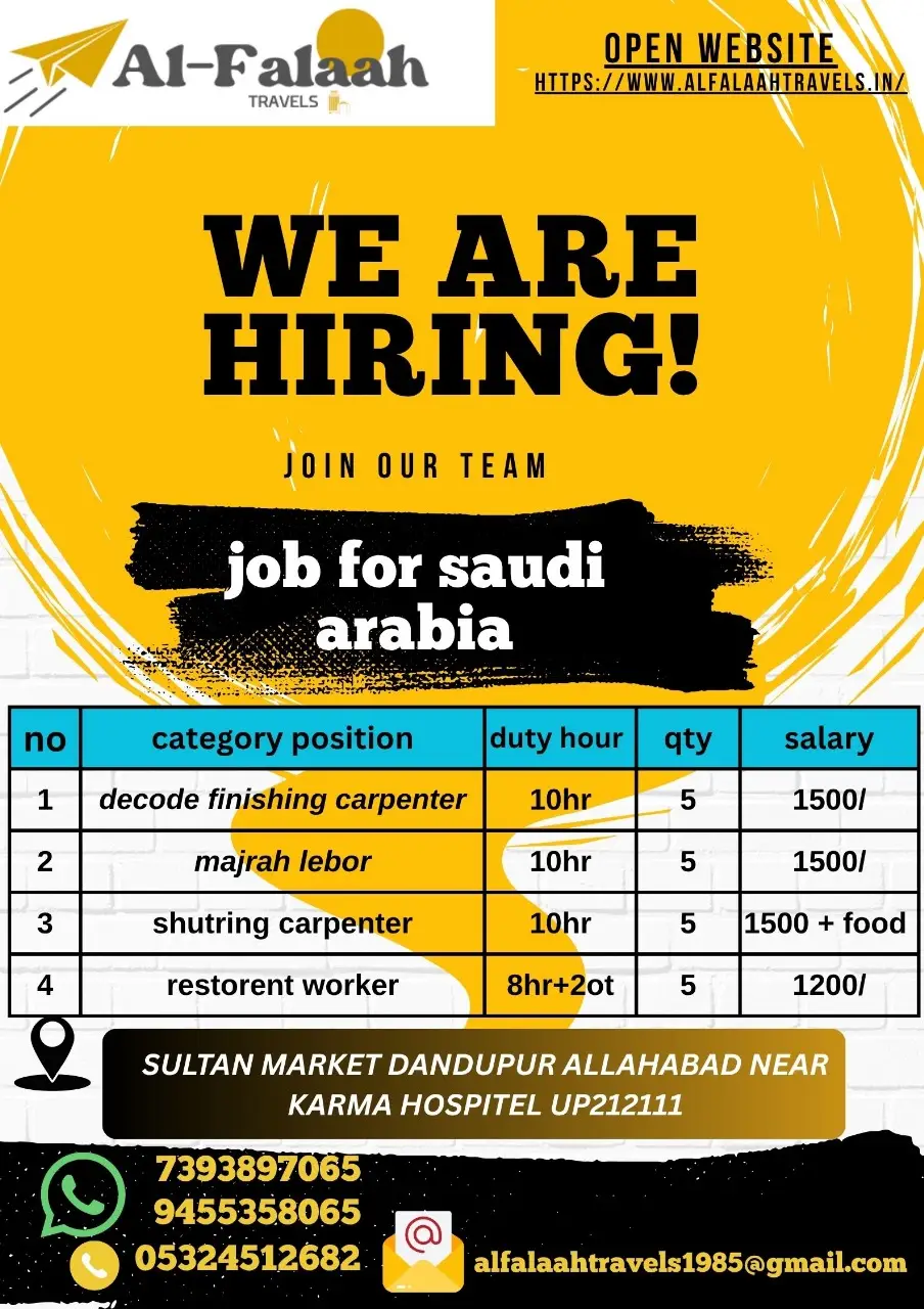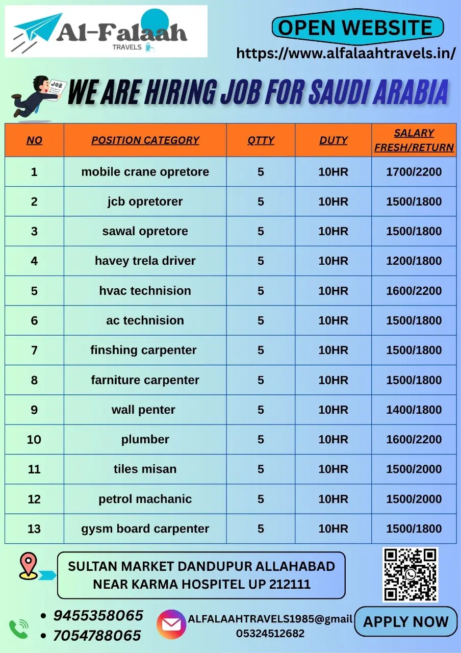 Al-Falaah Travels announces urgent recruitment for Saudi Arabia across multiple skilled categories. Attractive salary packages, 10-hour duty, and excellent benefits.
