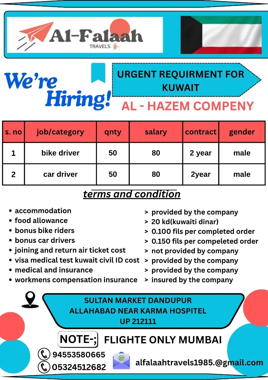 Urgent overseas job openings for Saudi Arabia and Kuwait by Al-Falaah Travels. Multiple categories including drivers, technicians, carpenters, labour, and mechanics. Attractive salary packages, food & accommodation, and company-provided benefits. Apply now from Sultan Market Dandupur, Allahabad.