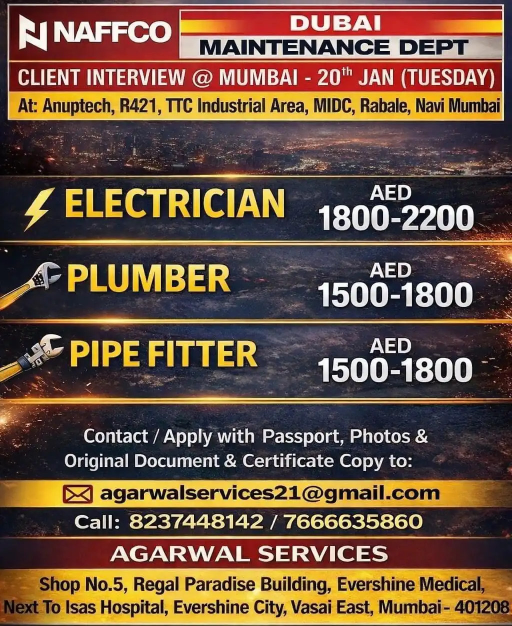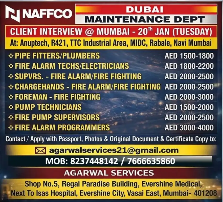 NAFFCO Dubai hiring for Maintenance and Fire & Safety departments. Client interview in Mumbai on 20th January. Vacancies include Electrician, Plumber, Pipe Fitter, Fire Alarm Technician, Supervisor, Foreman, Pump Technician & Programmers with salary up to AED 4000.