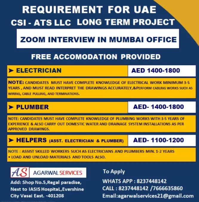 Urgent Requirement for UAE long-term project (CSI–ATS LLC). Vacancies for Electricians, Plumbers, and Helpers with attractive salaries. Zoom interview in Mumbai office. Free accommodation provided.