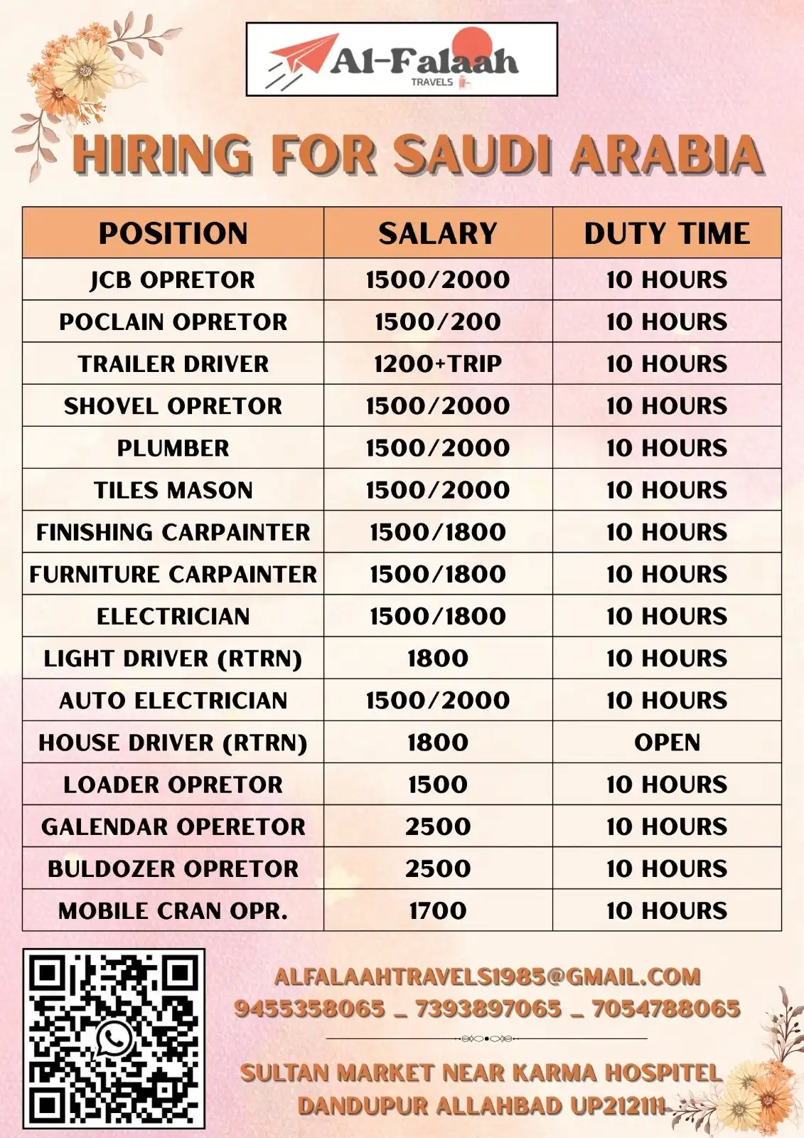 Saudi Arabia jobs | Al-Falaah Travels is urgently hiring skilled and experienced candidates for multiple vacancies in Saudi Arabia. Candidates with relevant experience in construction, heavy equipment operation, driving, and technical trades are encouraged to apply.
