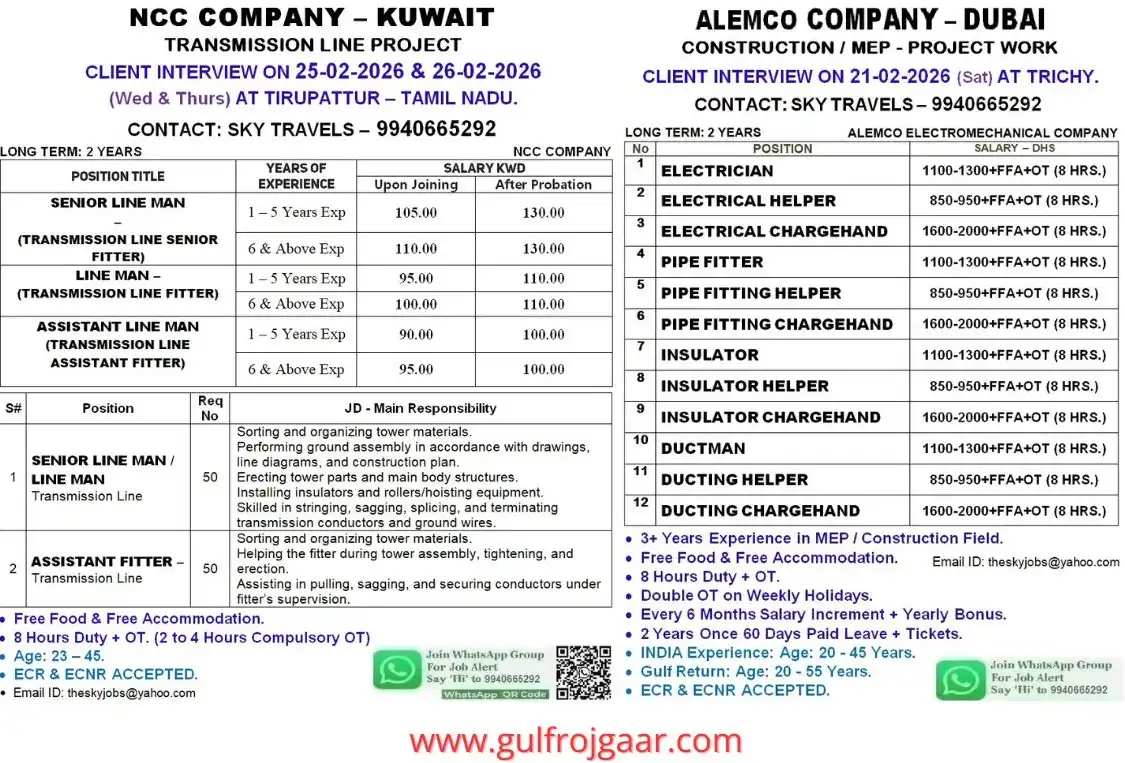 Urgent Gulf job openings for Kuwait and Dubai projects. Client interviews in Tamil Nadu for transmission line, MEP, electrician, pipe fitter, ducting, and helper positions. Free food, accommodation, overtime, and long-term contracts available. Apply now with Sky Travels.